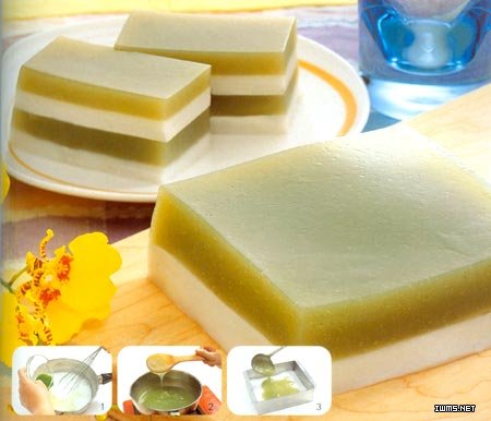 2,將材料(3)中的抹茶粉用少許冷水調(diào)拌開來(lái),再與其余材料(3)混合,置于爐子上邊煮邊攪拌,帶沸騰時(shí),快速攪拌至弄抽狀且呈透明色,即可以關(guān)火3,待圖一凝結(jié)了,就倒入圖二,待凝結(jié),即可以食用,食用時(shí)切塊!