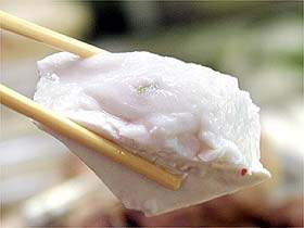 將雞胸肉縱切成絲,用刀背輕輕敲打,撒上精細(xì)食鹽和黃酒,放置4-5分鐘。雞蛋打入碗中,加冷水150毫升,調(diào)入小麥粉,迅速用力攪勻成蛋糊。雞肉絲蘸上蛋糊,在熱油中炸熟,撈出放在粳米飯上,撒以綠茶末、細(xì)鹽及干紫菜絲即成。