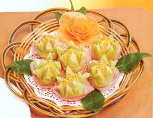 外層為綠茶味的酥皮及蛋黃和栗子做的餡制成,十?dāng)?shù)層的酥皮如鮮花初放,叫人不忍下口,酥餡香濃的栗子味,是怕甜的點(diǎn)心愛好者的首選。