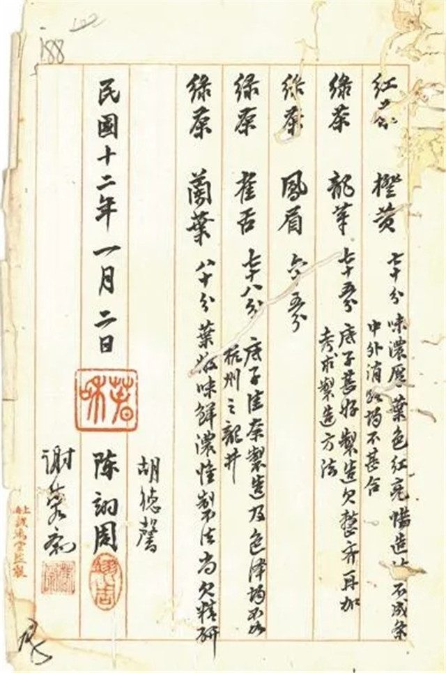 1922年11月,朱文精將實(shí)習(xí)所焙制的5種茶樣交實(shí)業(yè)司,轉(zhuǎn)送上海總商會(huì)延請(qǐng)專家評(píng)定。擔(dān)任上??偵虝?huì)展覽會(huì)茶葉審查員的胡德馨、陳翊周、謝蓉齋3位茶業(yè)專家在詳細(xì)查驗(yàn)品評(píng)茶樣后,聯(lián)合出具了報(bào)告書。報(bào)告書記載,5份茶樣,合紅茶1份,綠茶4份,分別是橙黃、龍華、鳳眉、雀舌、蘭葉。其中蘭葉“葉嫩味鮮濃”得分最高,獲得80分??傮w來看,專家們認(rèn)為茶業(yè)實(shí)習(xí)所送評(píng)的茶葉,無論紅茶還是綠茶,茶葉的底子都好,但制法上尚欠精研,還需提高。