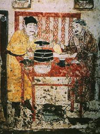見于河北宣化下八里村6號(hào)墓遼代壁畫。壁畫中共有6人,一人碾茶,一人煮水,一人點(diǎn)茶,反映了當(dāng)時(shí)的煮茶情景。
