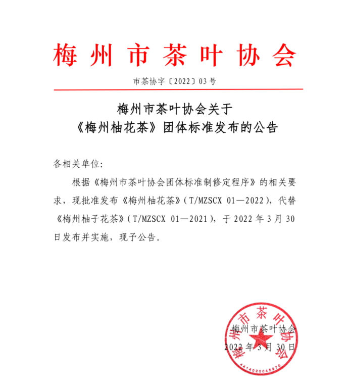 梅州市茶葉協(xié)會(huì)關(guān)于 《梅州柚花茶》團(tuán)體標(biāo)準(zhǔn)發(fā)布的公告
